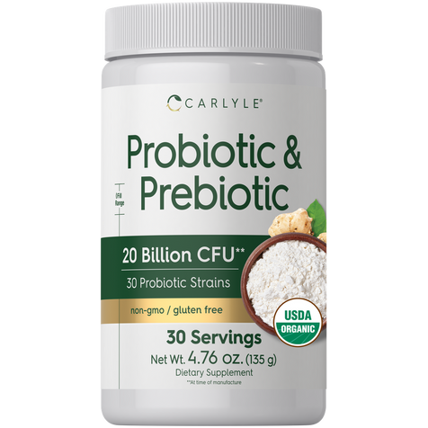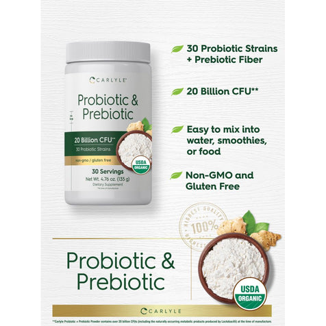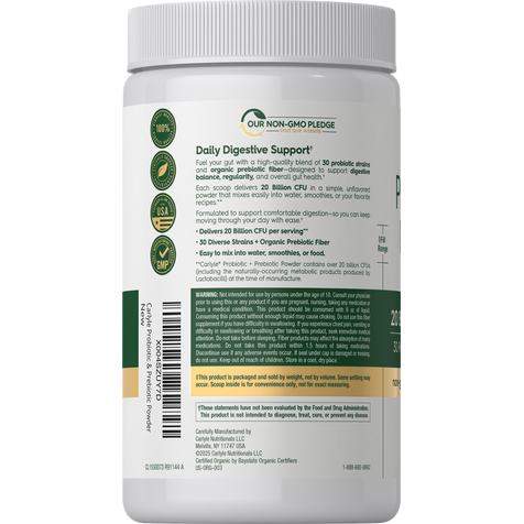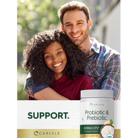 Experience the benefits of Carlyle's Probiotic + Prebiotic powder supplement, featuring 20 Billion CFU per serving.** Our vegetarian formula provides 30 diverse Probiotic strains plus Organic Prebiotic fiber. It's gluten free and non-GMO, made with no artificial sweetener or preservatives, making it a perfect choice for adult men and women everywhere!