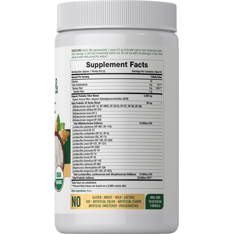 DUAL ACTION: Probiotic + Prebiotic features 30 Probiotic Strains plus Organic Prebiotic Fiber