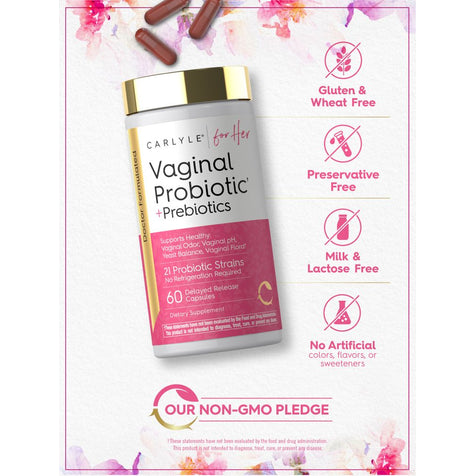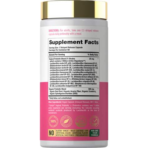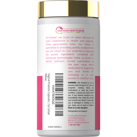 Carlyle delayed release capsules feature a Vaginal Probiotic 21 Strain Blend designed to help support healthy vaginal odor, pH, Yeast Balance and Flora.* Our vegan formula includes Lactobacillus acidophilus, rhamnosus, gasseri and more, plus a Prebiotic Blend for additional support. It's non-GMO and gluten free, making it an excellent probiotic of choice for women everywhere!