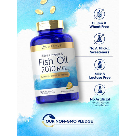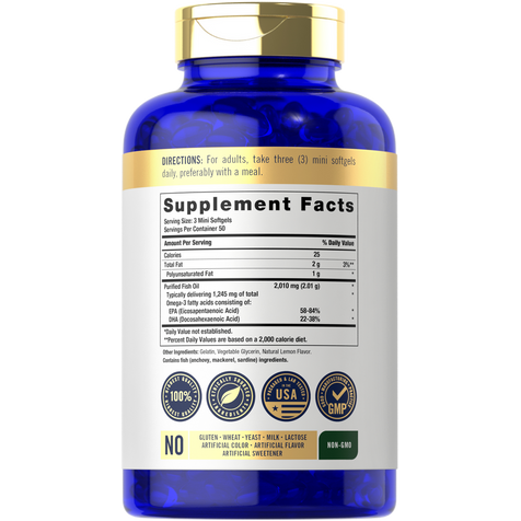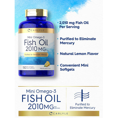 Obtén los beneficios del aceite de pescado Omega-3, ahora en cápsulas pequeñas y fáciles de tragar, con Carlyle Mini Omega-3 Fish Oil. Estas minis de tamaño perfecto proporcionan 2010 mg de Aceite de Pescado por porción y son una fuente premium de DHA y EPA que son ideales para hombres o mujeres. Nuestro aceite de pescado está purificado para eliminar el mercurio, asegurando pureza y calidad impecables, con un sabor natural a limón para que lo disfrutes.