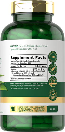 Découvrez la puissance des forêts tropicales avec Carlyle Bambou ! Cette formule incroyable est fabriquée avec les meilleurs ingrédients que la nature puisse offrir, offrant l'équivalent de 3 000 mg de bambou dans chaque capsule sans gluten et sans OGM. Elle est exempte de saveurs artificielles, d'édulcorants artificiels, de conservateurs, et est une source de silice naturelle pour un soutien quotidien.