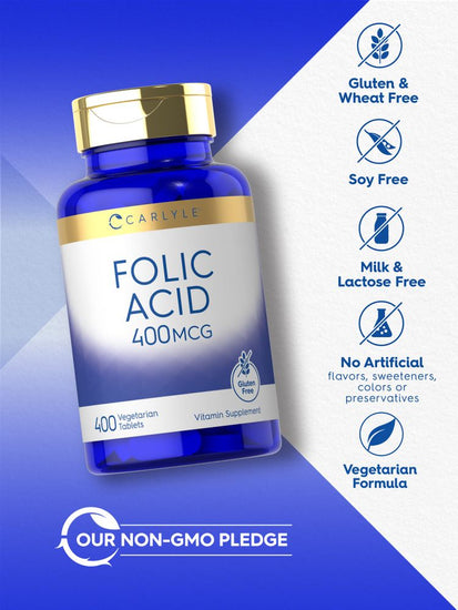 Chez Carlyle, notre formule avancée délivre 400 mcg d'acide folique, soit 167 % de votre valeur quotidienne sous forme de comprimés végétariens pratiques. Sans gluten et sans OGM, il est fabriqué sans colorant, arôme, édulcorant ou conservateur artificiel, ce qui en fait un excellent moyen pour les hommes et les femmes d'ajouter ce nutriment essentiel à leur routine quotidienne !