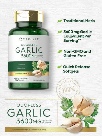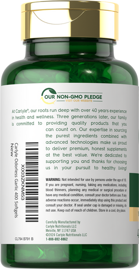 L'Ail Sans Odeur Carlyle est fabriqué à partir d'une source premium d'ail frais, conçu pour vous apporter les bienfaits sans aucune odeur! Notre formule sans gluten et sans OGM présente l'équivalent de 3600 mg d'ail par portion dans des gélules à libération rapide.** Elle est exempte de saveurs artificielles, d'édulcorants et de conservateurs, offrant la qualité exceptionnelle que les hommes et les femmes méritent pour leur routine quotidienne. Profitez de notre approvisionnement de 400 gélules dès aujourd'hui!