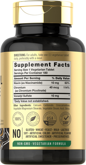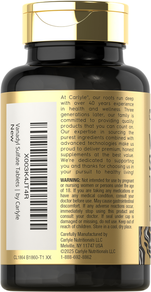 Découvrez le Sulfate de Vanadyl de Carlyle ! Les comprimés végétariens contiennent 10 mg de Sulfate de Vanadyl plus de la Niacine et du Chrome pour une absorption optimale. Notre formule est sans gluten et sans OGM, sans conservateurs, en faisant un choix de premier ordre pour une routine équilibrée.