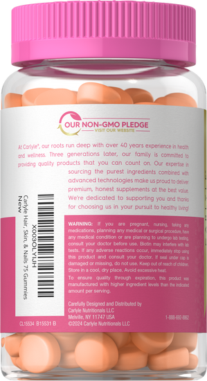 La nostra esperienza nel reperire gli ingredienti più puri, combinata con tecnologie avanzate, ci rende orgogliosi di offrire integratori premium e onesti al miglior prezzo. Le gomme Carlyle per Capelli, Pelle e Unghie* sono una testimonianza del nostro impegno verso l'eccellenza, realizzate con ingredienti potenti radicati nel benessere. Grazie per averci scelto nella tua ricerca di una vita sana.