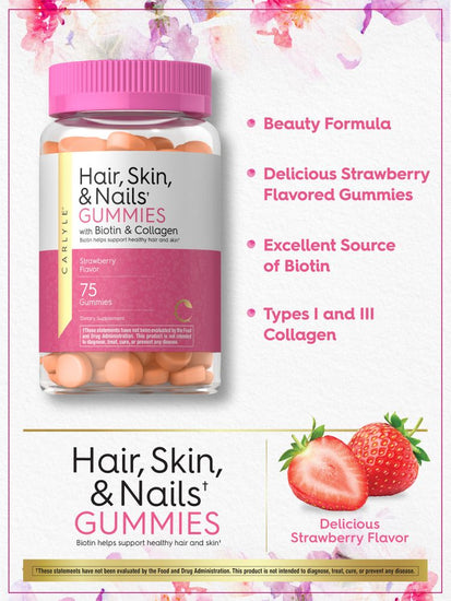 Le gomme Carlyle per Capelli, Pelle e Unghie offrono un'esplosione di delizioso sapore di fragola e nutrienti chiave per farti sentire impeccabile dentro e fuori! Ogni porzione fornisce 3.000 mcg di Biotina e 100 mg di Collagene di tipo I e II, insieme alle Vitamine C ed E per un supporto completo alla bellezza. La nostra formula avanzata è realizzata senza dolcificanti artificiali, la migliore formula nutrizionale per una routine ottimale.