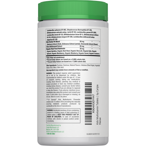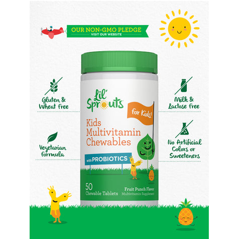 I Masticabili Multivitaminici per Bambini Lil' Sprouts sono arricchiti con una miscela di vitamine e minerali chiave, oltre a probiotici per un supporto aggiuntivo. La nostra formula presenta Vitamine A, B, C, D (come D3), E, Zinco, e altro ancora in un delizioso gusto di punch alla frutta che i bambini adoreranno! È senza glutine e non OGM, rendendolo l'aggiunta perfetta alla routine quotidiana dei tuoi bambini!