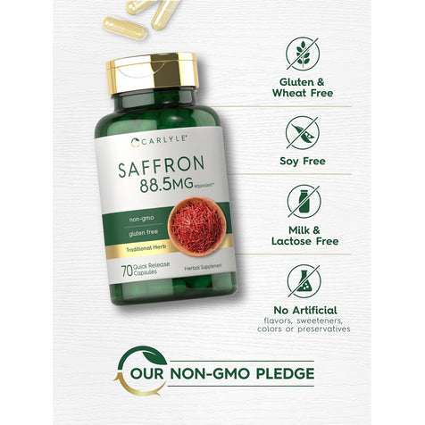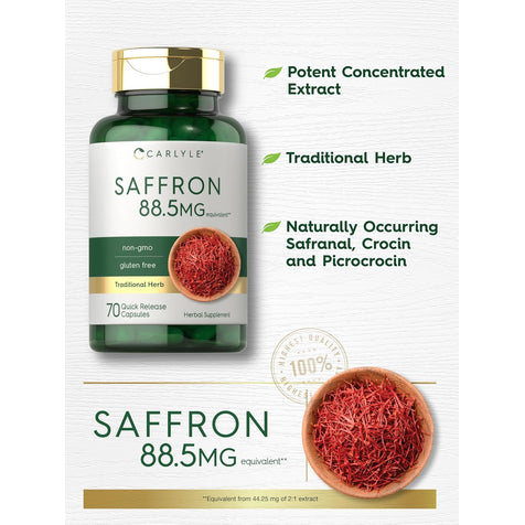 Lo Zafferano di Carlyle offre un modo semplice per ottenere i benefici di quest'erba tradizionale. Le capsule a rilascio rapido forniscono l'equivalente di 88,5 mg di Zafferano (da 44,25 mg di estratto 2:1). La nostra formula è senza glutine e non OGM, realizzata senza aromi artificiali, dolcificanti o conservanti, rendendo questo integratore una scelta top per uomini e donne ovunque!