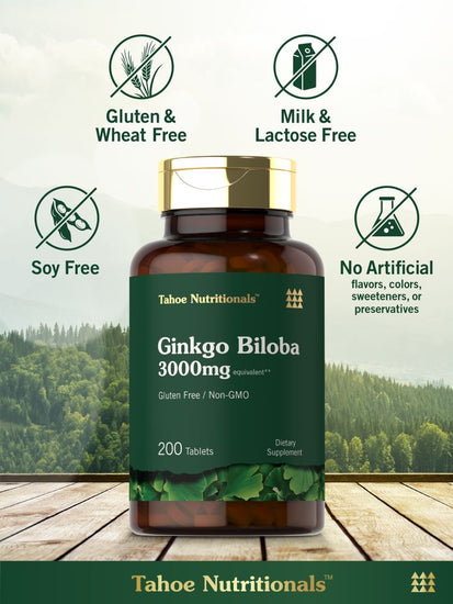Enjoy the benefits of Ginkgo Biloba with Tahoe Nutritionals! Vegetarian tablets feature the equivalent of 3,000 mg of this traditional herb in a premium leaf extract for daily support.** This powerful formula is standardized to contain 14.4 mg of Ginkgo Flavone Glycosides It's gluten free and non-GMO, making it a top choice of Ginkgo Biloba for adults everywhere! Enjoy our 200-tablet supply!