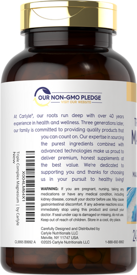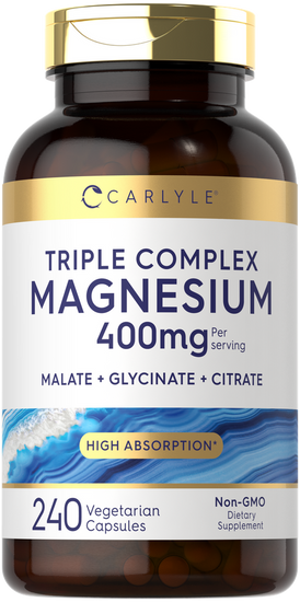 At Carlyle, each serving of our Triple Complex Magnesium features a unique 400 mg blend of Magnesium Malate, Glycinate and Citrate. Vegetarian capsules are gluten free and non-GMO, made with no artificial color or sweetener, making it a top choice of Magnesium for adults everywhere!